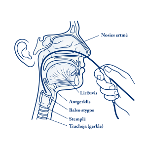 žemyn iki gerklaryklės ir gerklų stumia ploną, lankstų, vamzdelio pavidalo instrumentą,