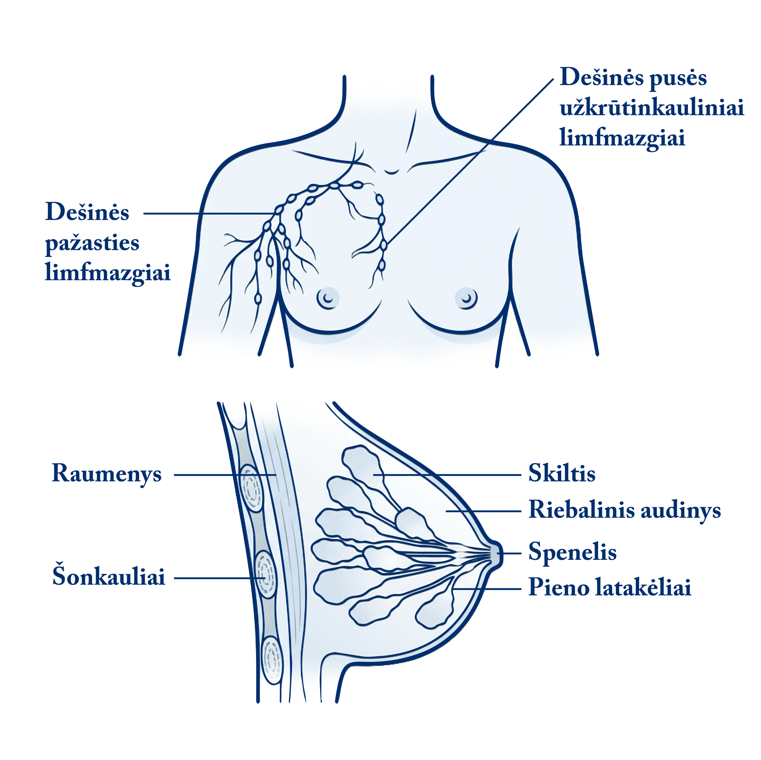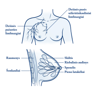 Dažniausias simptomas – aptinkamas, apčiuopiamas navikas už ar šalia krūties spenelio.